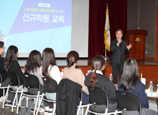 ▲ 유성훈 구청장이 신규직원들에게 공무원으로서의 기본소양에 대해 이야기하고 있다. |