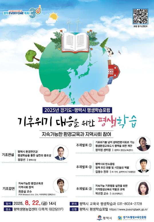 기조연설은 정장선 평택시장이, 기조 강연은 최운실 아주대학교 명예교수가 맡는다. 이후 평택시의 탄소중립 정책 추진 현황과 기후 위기 대응을 위한 지역 평생교육의 역할 등 주제 발표가 이어질 계획이다.