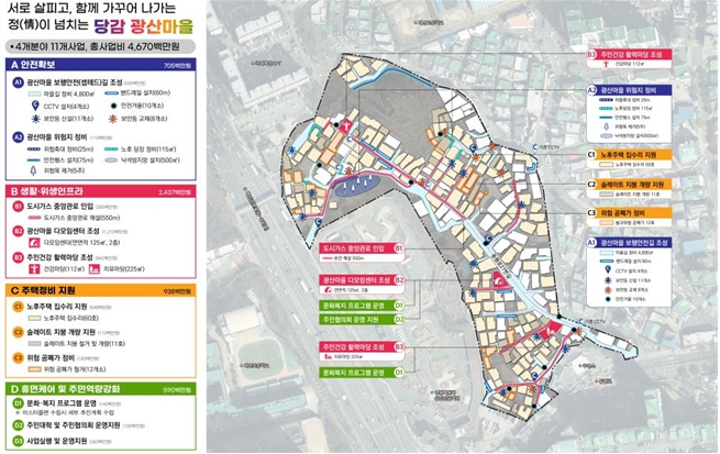 부산진구는 1960~70년대 피란민들이 함께 모여 정착된 당감1동 20~22통 일원의 광산마을을 대상으로 ▲위험지 및 방치 공폐가 정비 ▲도시가스 중앙관로 인입 ▲노후주택 정비 등의 사업을 진행할 예정이다.
