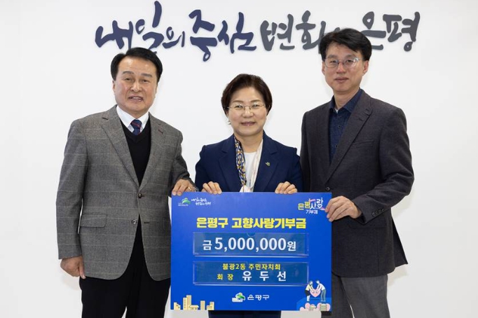이번에는 유두선 불광2동 주민자치회장이 은평구 고향사랑기부제 고액기부자 명단에 이름을 올렸다. 지난 14일 은평구청에서 고향사랑기부금 500만 원 전달식이 진행됐다.