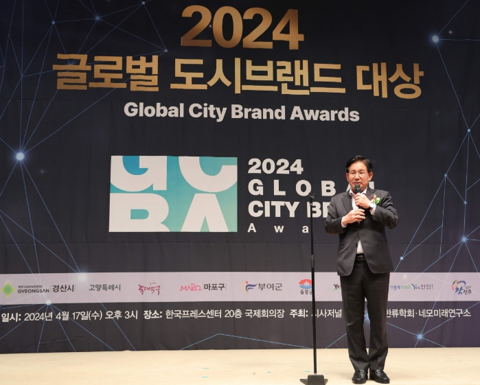 ▲ 마포구가 17일 오후 한국프레스센터에서 ‘2024 글로벌 도시브랜드 대상’ 도시관광 부문 대상을 수상해 박강수 마포구청장이 소감을 발표하고 있다 |