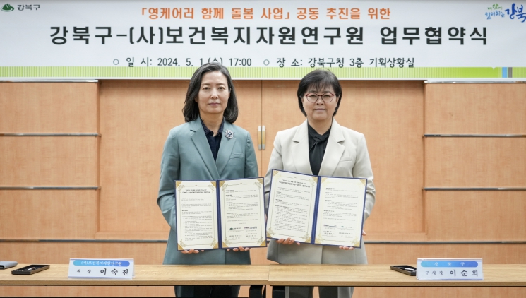▲ 이순희 강북구청장(오른쪽)과 이숙진 (사)보건복지자원연구원장이 강북구청 기획상황실에서 열린 '영케어러 함께 돌봄 사업' 공동 추진 업무협약식에서 기념사진을 찍고 있다. |
