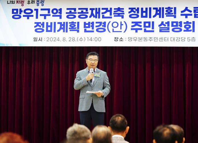 이번 설명회는 2011년 7월에 결정된 망우1구역 정비계획을 주택 공급 확대를 위한 공공재건축사업으로 본격 추진하기 위해 마련됐다. 이날 열린 설명회에서는 망우동 178-1 일대 염광아파트와 인근 노후 주택의 용적률 완화와 망우1구역 종상향 등 변경된 정비계획을 주민들에게 설명하는 시간을 가졌다.