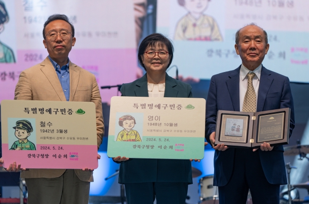 이에 구는 우이천변 페스타 2024를 시작으로, 앞으로 강북구 문화관광 등 다양한 분야에서 ’철수와 영이‘와의 인연을 이어가고자 행사 첫날인 24일 ’철수와 영이‘에 특별 명예구민증을 수여했다. 특별 명예구민증은 이순희 강북구청장이 직접 수여했으며, 김주영 씨가 ’철수와 영이‘를 대신해 전달받았다.