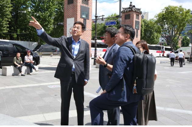 ▲ 인사동 일대 현장점검을 진행하는 정문헌 종로구청장과 구 관계자의 모습 |