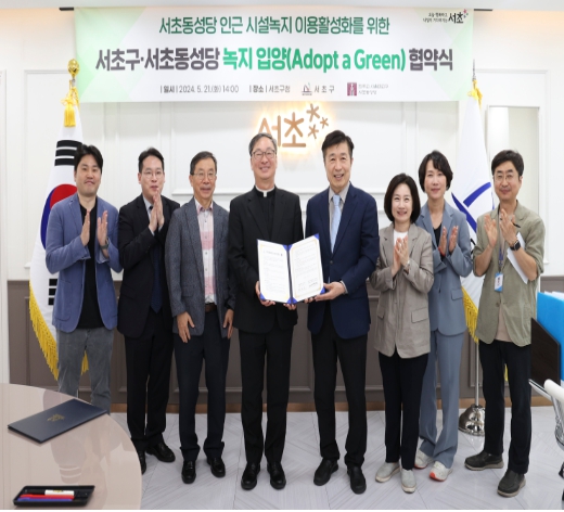 [뉴스서치] 서울 서초구가 지난 21일 천주교 서울대교구 서초동성당과 제1호 녹지입양 협약을 체결하며, ‘녹지 입양제’를 서울시 최초로 시행한다고 밝혔다.