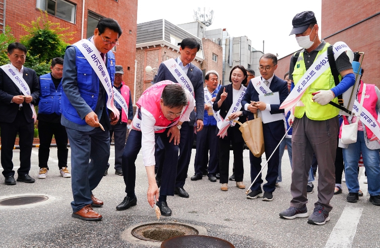 이에 정문헌 구청장과 바르게살기운동 종로구협의회, 종로구통장연합회 등 100여 명이 모기유충구제 사전 교육에 이어 캠페인, 주변 정화조에 구제제를 투여하는 현장실습에 함께했다.