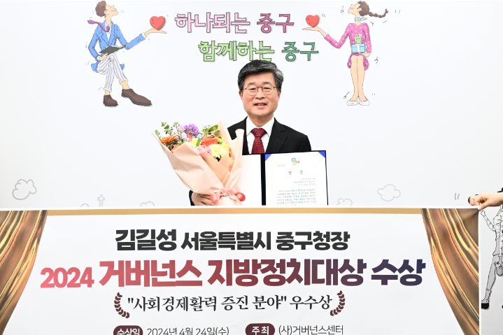 [뉴스서치] 김길성 중구청장이 ‘2024 거버넌스지방정치대상’사회경제 활력 증진분야에서 우수상을 받았다고 24일 밝혔다. 지난 2년간‘도심재생과 산업활성화’를 위해 추진한 사업이 긍정적인 평가를 받은 결과다.