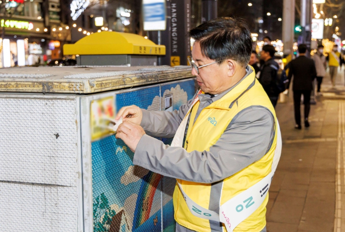 ▲ 지난해 2월 도화동 인근 지역에서 실시된 불법 광고물 합동 단속에서 박강수 구청장이 불법 셔츠룸 광고 스티커를 제거하고 있다. |