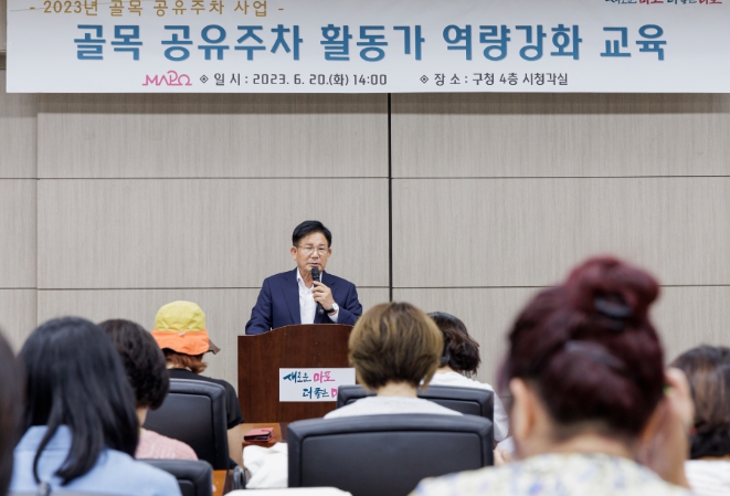 ▲ 지난해 6월, 골목 공유주차 활동가 역량강화 교육에 참석해 인사말을 전하는 박강수 마포구청장 |