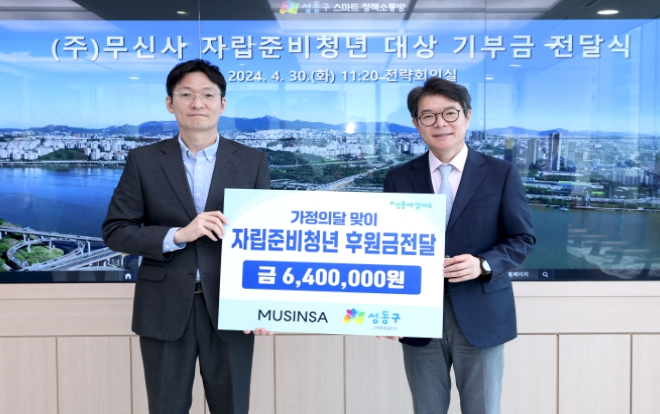 [뉴스서치] 서울 성동구는 5월 '가정의 달'을 맞아 무신사와 함께 성동구 거주 자립준비청년에게 기부금을 후원한다고 밝혔다.