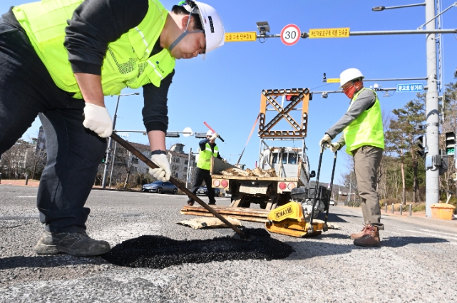 ▲ 시민들의 안전을 확보하기 위해 수원시가 운영하고 있는 ‘포트홀 25시 기동대응반’ 작업자들이 도로에 발생한 포트홀을 긴급히 보수하고 있다. |