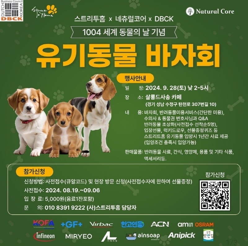 이번 행사는 다음달 28일 경기 성남 수정구 살롱드사송 카페에서 오후 2시부터 5시까지 열린다. 접수는 이달부터 다음달 6일까지 받는다. 반려동물 사료업체 네츄럴코어와 주한 네덜란드 경제인협회 등이 후원하는 이번 행사에는 오스람코리아, 불가리코리아, 인피니언 테크놀로지스, 에이엘, (주)애니픽, 삼영비앤에프, 아인솝, 니오라 ACN, 버박코리아, 지에프머시닝(GF machining), 미려코스메틱등도 참여한다.바자회에서 모여진 후원금은 전액 유기동물 사상충 치료와 관리 비용으로 쓰여질 예정이다.