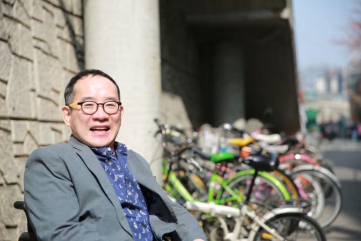 ▲ 1인1책 사무실 앞에서 밝게 웃는 고정욱 작가 [사진=1인1책 제공] |