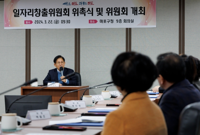 ▲ 3월 마포구 일자리창출위원회가 열려 박강수 마포구청장이 안건을 설명하고 있다 |