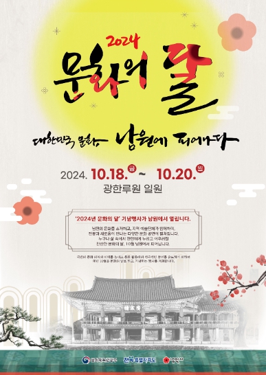 ‘문화의 달’ 기념행사는 지역 문화예술의 저변을 넓히고 각 지역의 특색있는 문화를 알리기 위해 2003년부터 매년 전국을 순회하며 개최하고 있다. 올해는 ‘대한민국 문화, 남원에서 피어나다’를 주제로 10월 18일부터 20일까지 남원시 광한루원 일대에서 개최한다. 이번 개막식에서는 왕기석·이난초 명창의 판소리 맞이공연을 시작으로, 가수 송가인과 국립민속국악원의 합동 공연, 남원 시민 300명이 참여한 시민 합창단의 ‘아름다운 나라’ 공연 등으로 축제의 막을 올린다. 기념행사 기간(10. 18.~20.)에는 광한루원 완월정, 예루원 무대 등에서 전통국악의 진수를 보여주는 명인·명창 공연과 더불어 퓨전국악 공연을 통해 전통의 선율과 현대의 리듬이 어우러지는 다채로운 공연과 부대행사가 펼쳐진다. 기념행사에 대한 더욱 자세한 일정과 정보는 ‘문화의 달’ 공식 누리집에서 확인할 수 있다.
