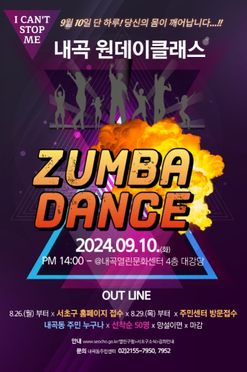 [뉴스서치] 서울 서초구 내곡동주민센터에서는 내달 10일 신나는 댄스 한마당이 펼쳐진다. 구는 주민센터 프로그램으로 ‘줌바댄스 원데이클래스’를 앞두고 이달 26일부터 참가자를 모집한다고 밝혔다.