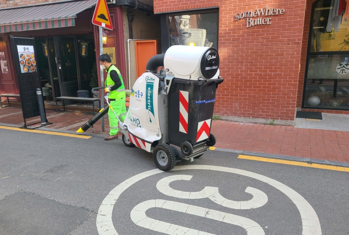 ▲ 성동구 성수동(서울숲 카페거리)에서 ‘365 청결기동대’가 친환경 도시형 거리청소기 ‘글루통’으로 도로 위 쓰레기를 수거하고 있다. |