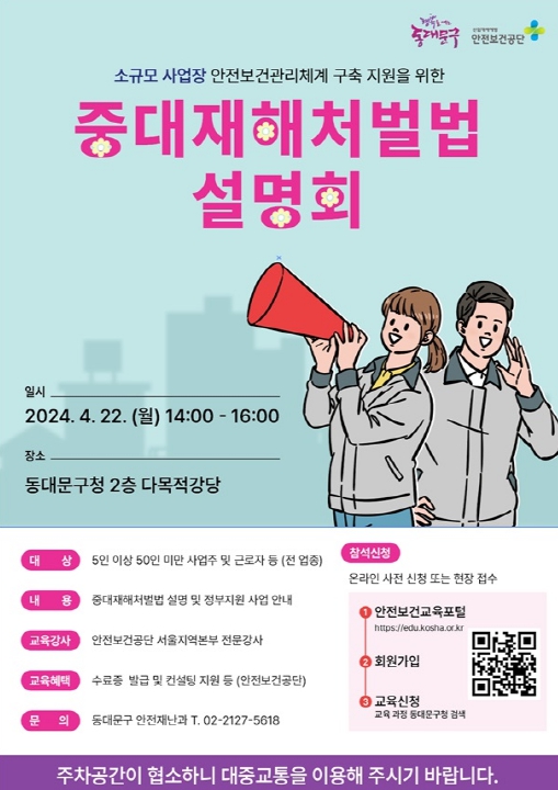 이필형 동대문구청장은 “중대재해처벌법 관련 내용을 숙지하지 못해 처벌받는 일이 발생하지 않도록, 50인 미만 사업장을 운영하는 사업주들의 많은 관심과 참여 바란다”고 밝혔다.