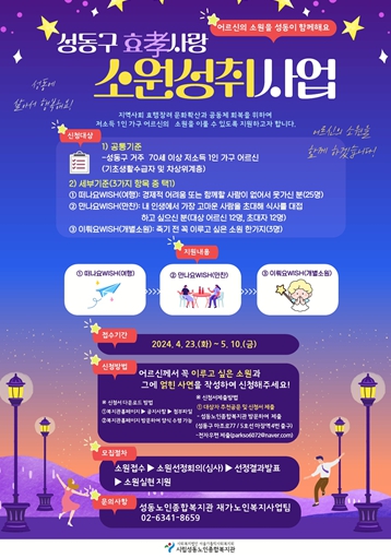 신청 기간은 5월 10일까지로 해당 분야에 따른 구체적인 소원과 그에 얽힌 사연을 작성해 성동노인종합복지관에 제출하면 소원선정 심사위원회의 심사를 거쳐 대상자가 선정된다. 신청서는 성동노인종합복지관 누리집에서 내려받을 수 있다.