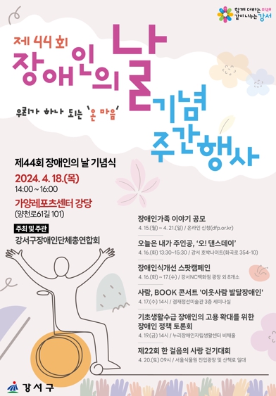 [뉴스서치] 서울 강서구가 오는 20일 44번째 장애인의 날을 기념해 장애인과 비장애인의 벽을 허무는 특별한 한 주를 마련했다.