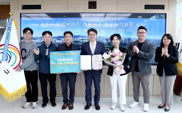 성동구는 지난 4일 서울정부청사 별관 2층에서 열린 2023년 민원서비스 종합평가 시상식에서 ▲민원행정 전략과 체계 ▲민원제도 운영 ▲국민신문고 민원처리 ▲고충민원 처리 ▲민원만족도 등 5개 평가항목 전 분야에서 고르게 높은 평가를 받아 전국 자치구 중 종합 1위로 국무총리표창을 수상하게 됐다.