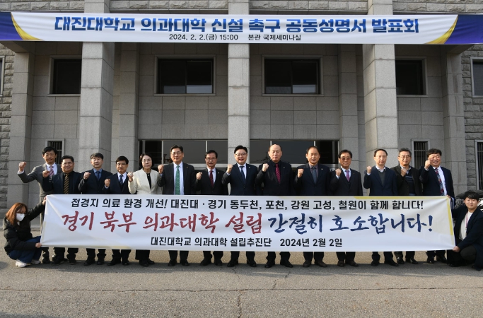 올해 2월 2일에는 대진대학교 의과대학 설립 추진단 주관으로 동두천, 포천, 강원도 고성 지자체장과 기초의회 의장 등이 참석한 가운데‘경기 북부 의과대학 신설 촉구’공동성명서를 발표했다. 대진대학교 의대 유치를 염원하는 경기 북부 및 강원 북부 지자체가 한마음으로 대정부 요구안을 외쳤다.