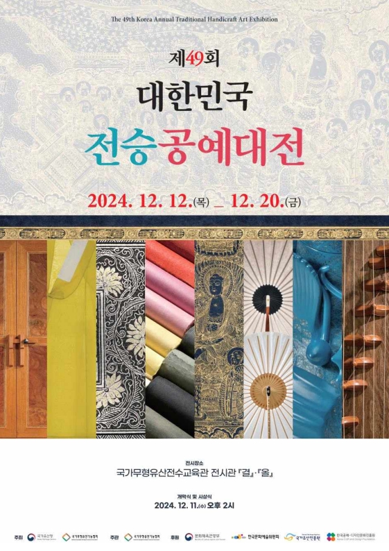 [뉴스서치] 국가유산청은 오는 12일부터 20일까지 국가무형유산전수교육관 전시관 ‘결·올’(서울 강남구)에서 (사)국가무형유산기능협회(이사장 이재순)와 공동으로 '제49회 대한민국전승공예대전(이하 ‘전승공예대전’)'를 개최하고, 수상작 151점을 전시한다. 전시 시작 하루 전인 11일 오후 2시 국가무형유산전수교육관 민속극장 풍류에서 개막식과 시상식이 개최된다.