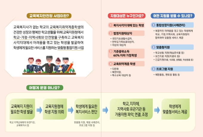‘교육복지안전망 구축 사업’은 관내 교육복지사가 없는 초·중·고를 대상으로 복지 사각지대 및 복합적인 어려움을 겪고 있는 학생을 발굴하고, 교육지원청이 중심이 되어 학교, 지역사회가 안전망을 구축하여 학생에게 학교 적응력 향상과 교육적 성장을 위해 통합적·맞춤형 교육복지 서비스를 지원하는 사업이다.