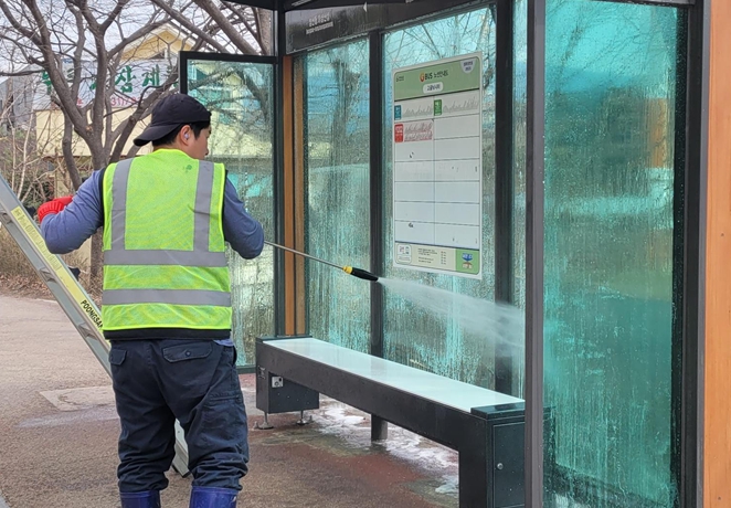 ▲ 하남시가 겨우내 쌓인 지역 버스정류소의 묵은 때를 씻어내기 위해 고압수를 활용해 봄맞이 대청소를 실시하는 모습 |