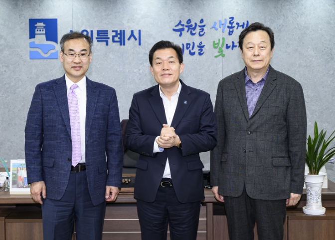 ▲ 이재준 수원시장(가운데)과 오태환 KSEA 차기회장(왼쪽), 이주연 아주대학교 산업공학과 교수(오른쪽)가 함께하고 있다. |