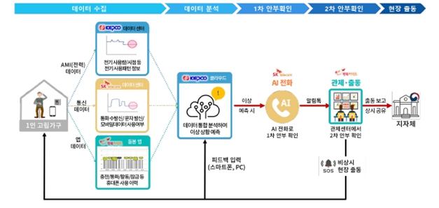 ‘AI 안부든든 서비스’는 대상자 가정 내 별도 기기 설치 없이 원격검침계량기(AMI)를 통해 확인하는 전력 사용량과 통신 빅데이터․돌봄 앱 데이터 등을 전문 관제팀에서 상시 모니터링 및 분석해 사회적 고립 위기 가구의 고독사 및 거동불능 등 위험 발생 시 112․119와 함께 신속한 구호를 통해 피해를 예방하는 서비스이다.