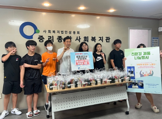 ▲ 법동청소년문화센터 늘해랑 청소년방과후아카데미 학생들이 친환경 제품 나눔행사를 진행하고 있다. |