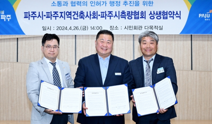[뉴스서치] 파주시는 26일 파주지역 건축사회, 파주시 측량협회와 함께 ‘2024 소통과 협력의 인허가 행정 추진을 위한 상생협약식’을 개최했다.