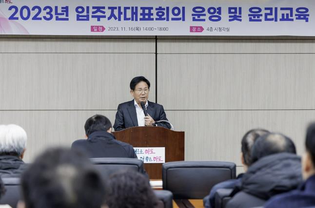 ▲ 박강수 마포구청장이 2023년 입주자대표회의 운영 및 윤리교육에 참석해 주민들과 소통하고 있다. |