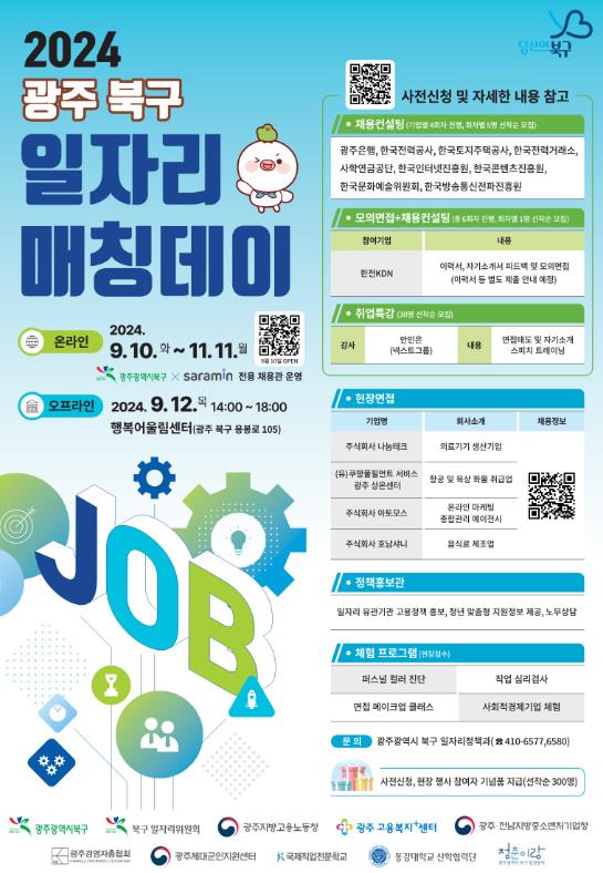 오프라인 매칭데이 참여를 희망하는 주민은 구글 폼을 통해 선착순 신청하면 되고 온라인 매칭데이는 북구 전용 채용관 홈페이지 사이트를 통해 구인 기업과 구직자 참여 신청이 상시 접수되며 자세한 사항은 북구청 일자리정책과에 문의하면 된다.