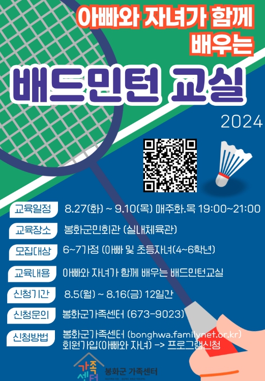 [뉴스서치] 봉화군가족센터는 ‘2024년 아빠와 자녀가 함께 배우는 배드민턴 교실’에 참여할 아버지와 자녀를 모집한다.