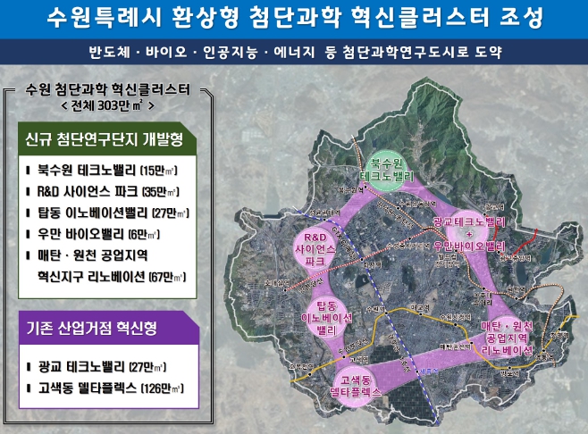기존 산업거점인 광교테크노밸리, 델타플렉스와 새롭게 조성할 북수원테크노밸리, R&D 사이언스파크, 탑동 이노베이션밸리, 광교 바이오 이노베이션밸리, 우만바이오밸리, 매탄·원천공업지역 리노베이션 등으로 클러스터가 구성된다.