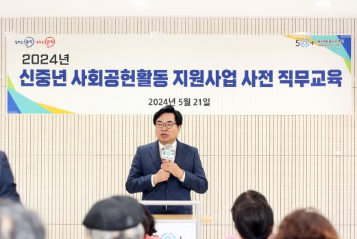 ▲ 박일하 동작구청장이 지난 5월 동작50플러스센터에서 열린 신중년 사회공헌활동 직무 교육에 참석해 인사말을 하고 있다 |