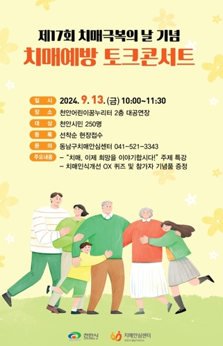 [뉴스서치] 천안시 동남구 치매안심센터는 9월 13일 천안어린이꿈누리터 대공연장에서 치매 인식 개선과 치매 극복을 위한 ‘제17회 치매극복의 날 기념 치매예방 토크 콘서트’를 개최한다고 29일 밝혔다.