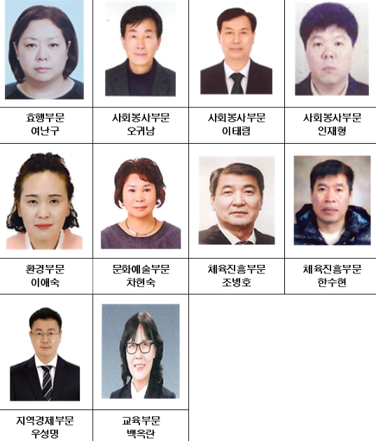 부문별 수상자로는 ▲효행부문 여난구(여·59), ▲사회봉사부문 오귀남(남·65), 이태림(남·63), 인재형(남·63), ▲환경부문 이애숙(여·54), ▲문화예술부문 차현숙(여·69), ▲체육진흥부문 조병호(남·73), 한수현(남·57), ▲지역경제부문 우성명(남·56)), ▲교육부문 백옥란(여·62)이 선정됐다.