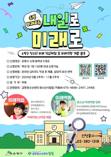 ‘내일로 미래로’ 프로그램은 학사일정에 따라 오는 7월부터 5개 중학교 대상으로 추진된다. 신청을 원하는 학교는 포스터를 참고해 QR코드로 제출하거나 담당자로 전화하면 된다. 향후 프로그램 진행 결과는 은평구 갈현청소년센터 페이스북, 네이버 블로그, 인스타그램 등을 통해서 확인할 수 있다.