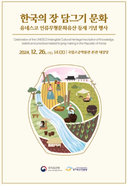 [뉴스서치] 국가유산청은 국가유산진흥원과 함께 12월 26일 오후 2시에 국립고궁박물관 본관 대강당(서울 종로구)에서 '한국의 장 담그기 문화'의 유네스코 인류무형유산 대표목록 등재를 기념하는 행사를 개최한다.
