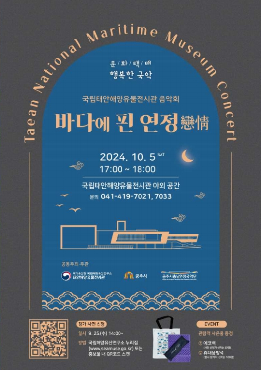 이번 공연은 지역 주민을 위한 문화공간으로서 전시관의 역할을 확대하고, 해양유산에 대한 관심을 높이고자 마련됐다. 전통음악부터 창작음악에 이르기까지 다양한 연주 활동으로 충남도민과 공주시민의 문화향유 기회 확대에 앞장서고 있는 공주시충남연정국악단이 진행 중인 '문화택배-행복한 국악' 공연의 일환으로 다채로운 무대를 선보인다.
