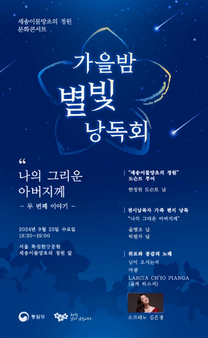 9월에는 아름다운 “세송이물망초의 정원” 야경을 배경으로 '가을밤 별빛 낭독회'를 개최했으며, 납북피해자 자녀 두 분이 납북된 아버지를 그리워하는 편지를 낭독했고, 김은경 소프라노의 피해 가족들에 대한 위로의 공연을 통해 납북 문제 해결에 대한 우리 국민들의 관심과 지지를 호소하는 의미 있는 시간을 가졌다.