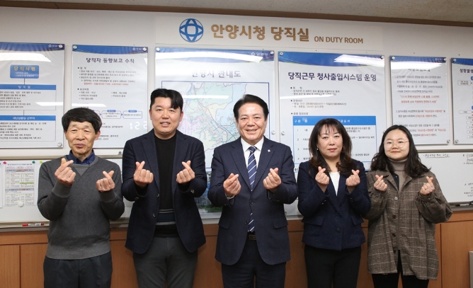 최대호 안양시장은 양성 통합당직 실시에 따른 첫 근무자를 격려하기 위해 18일 오후 당직실에 방문했다.