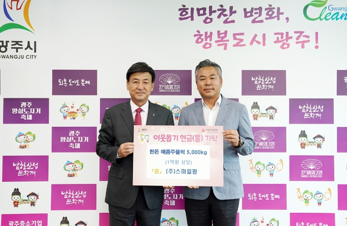 [뉴스서치] 농업회사법인(주)스마일팜 김천석 대표는 지난 27일 어려운 이웃을 위해 사용해 달라며 광주시에 국내산 매콤삼겹주물럭 4천500㎏, 국내산 매콤목심 주물럭 500㎏(1억원 상당)을 기탁했다.