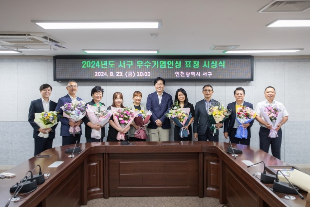 [뉴스서치] 인천 서구가 23일 지역경제 활성화에 기여한 모범기업체 대표의 사기 진작을 위하여 2024년도 서구 우수기업인상 표창장을 수여했다.