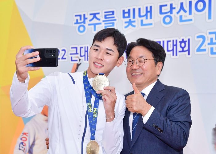 ▲ 강기정 광주광역시장이 지난 2022년 8월 8일 오전 시청 시민홀에서 열린 ‘2022 근대5종 세계선수권대회 2관왕 전웅태 선수 환영식’에 참석해 전웅태 선수와 셀카를 촬영하고 있다./광주광역시 제공 |