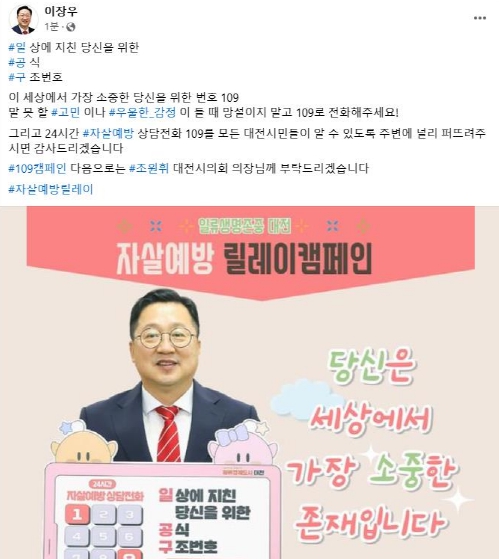 [뉴스서치] 이장우 대전시장이‘내 마음을 살리는 번호 109 캠페인’ 릴레이 1호 주자로 참여하면서 캠페인 시작을 알렸다.